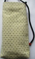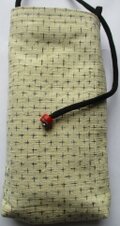 中綿を入れ、袋の縁に正絹の黒のループとループの輪っかを付け、ループを通して結ぶようにしています。