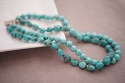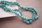 原石の雰囲気が感じられるタンブルターコイズは、ブラウンのシルク糸で1粒ずつノット留めしているので、ターコイズの間から覗く糸のカラーもポイントに!お楽しみ頂けます。