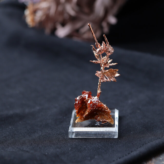 素材:バナジン鉛鉱(モロッコ産/Mibladen)・アメリカフウロ(銅コーティング)・アクリルベース