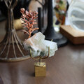 ベンケイソウ科の一属で、およそ35種を含む多肉植物。冬生育型の多肉植物の代表的な存在です。使用したのは、「小人の祭り」と「サンデルシー」の交配とされる「小人の花束」という種。葉の根元から新しい茎が伸びる独特の造形。結晶の隙間に着生し、根っこで鉱物を抱えながら養分を得て育っていく様子のオブジェです。真鍮の専用スタンドに飾って楽しんでください。