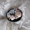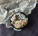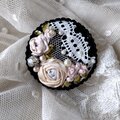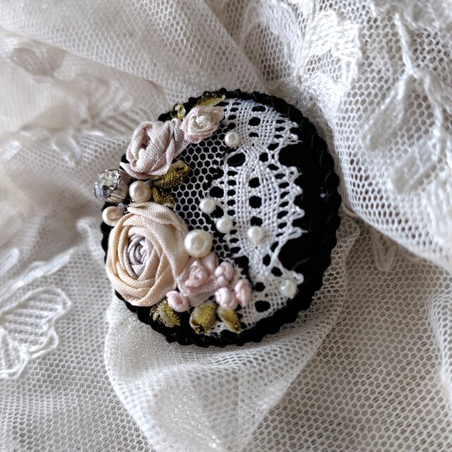 黒地にアンティークレースをのせ、アンティークカラーのリボンで薔薇を刺繍したブローチです。