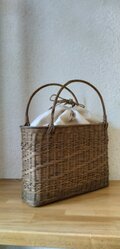 ♪ かごのサイズに合わせた巾着も作ってみました。かごに取り付けませんでしたので、万が一巾着を汚してしまっても巾着は洗濯できますし、他の同じサイズのかごにも使用できるようにしてみました。