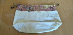 ♪ かごのサイズに合わせてリバティ生地と生成り生地を縫い合わせた巾着も作ってみました。かごに取り付けませんでしたので、万が一巾着を汚してしまっても巾着は洗濯できますし、他の同じサイズのかごにも使用できるようにしてみました。