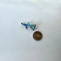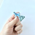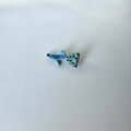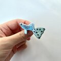全体の色味は優しいブルーですが、しっぽはラメの入った細い刺繍糸を使いビーズで水玉を表現したおしゃれなグッピーの刺繍ブローチです。