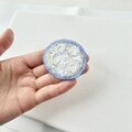 青色のフロストビーズをブローチ枠のように配置して遠くから見た時に楕円形の美しい形が印象的になるように製作しました。