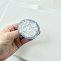こちらは、少しくすんだブルーのフロスト(すりガラス調)のビーズで囲んだ楕円形のブローチです。内側には、光の加減で輝くうすいブルーのガラスビーズを加え、優しく静かにしとしとと、降る雨を記憶したブローチです。