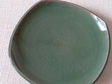 透明感のある深い緑に細かく入った貫入と象嵌模様が美しい作品です。
