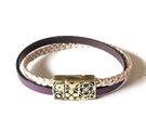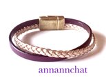 ヨーロッパ製の高級本革 5mm幅の 三つ編みのローズゴールド・5mm幅 濃い紫の2本を 交差させお洒落な ブレスレットを作りました。