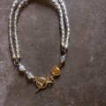 グレーオニキスの石言葉は平和・勇気・まとまり・チャンスを掴む等ですが、魔除けや厄除けの効果もあるとされていることから、フランスのヴィンテージメダイのマリア様を付けました。メダイの素材はアルミニウムになります。