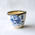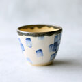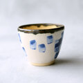 白い化粧泥の上に呉須の藍色でリズミカルに模様を描いたモダンアート柄のフリーカップ(湯呑)です。