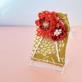 柳色の落ち着いた地に、つまみ細工で咲く赤い花が、まるで空に咲いた一輪の華
