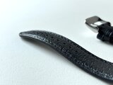 革製品の中で非常に精密さが問われるウォッチベルト。専用の治具を使って立体的に貼り合わせる事で、手首にピッタリと張り付くような湾曲構造を実現しました。加えて、剣先は外側へテンションをかける貼り合わせになっており、使用時にありがちな遊革( ※動くサルカン )のアソビを防止しています。表革は高い耐久性を誇る栃木レザー、直接手首に触れる裏革には通気性の高いアメ豚を採用。内部は床革を挟み込みふっくらさせる事で、奥行きのある黒の光沢に動きを持たせました。真っ直ぐと伸びるステッチとすぐ脇を走る焼き締められたフチ捻が、硬派でスマートな印象を与えてくれます。豊かな革の表情をお楽しみ頂きながら、ギュッと閉じ込められた職人技を手首を通じて感じて頂けると幸いです。