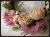 オフホワイトに薄いピンク色がほんのりと綺麗なシャクヤクにピンクの華やかなアジサイがメインのwreathです。