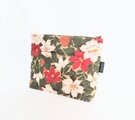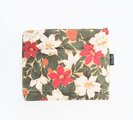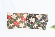 濃いベージュ地に白と紅色の花、ラメ入り金彩花の綿ツイル生地を使用しています。
