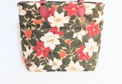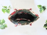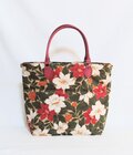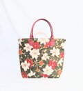 濃いベージュ地に白と紅色の花、金ラメ入り金彩花柄の大き目サイズで2Wayとしてお使い頂ける大人可愛いお出掛けバックです。