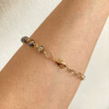 ひとつひとつ模様が違うブルーとブラウン、ホワイトのチェコガラスと、透明の芯がゴールドカラーのチェコガラスのブレスレットです。