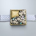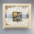 25mm角の小振りな帯留め 桧の木地を葡萄文様に深く彫刻し、浮き彫りにした文様部分を純金蒔絵・純銀蒔絵と螺鈿細工で加飾した金沢漆器の帯留。