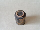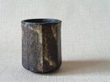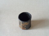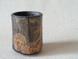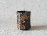 この作品は、信楽の土を使いろくろで作った湯のみをやわらかいうちにヘラで押さえて八角にし、つわぶきを手描きで少しづつ加彩し焼成を重ねて仕上げています。味わい深い黒釉に金で丁寧に描いた花が映える華やか湯のみです。