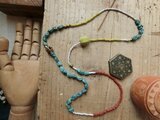 ターコイズのナゲットビーズ2種と黄色と赤茶の古びた色のビーズ(多分アフガニスタンのもの)白の古色のシードビーズはジャワの現行品でポイントにアフリカの真鍮ビーズ、古代のジャワのみかん玉(出土ビーズ)を自由に繋いでいます。