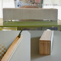 木口を活かした合板に、落ち着いた風合いのリノリウムを組み合わせて、素朴さとモダンさを両立させました。