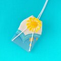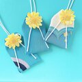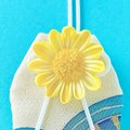 白い紐が爽やかなアクセントとなり、ヒマワリの明るい印象を引き立てています