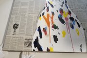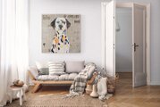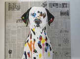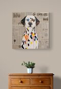 動物シリーズからダルメシアンの1メートル正方形作品!本作は正方形キャンバスに英字新聞がコラージュされた背景、そこに佇むダルメシアンをモダンにポップに描いており、お洒落にスタイリッシュに飾って頂けます。