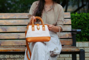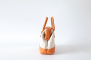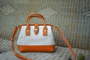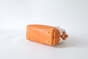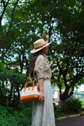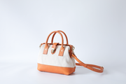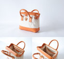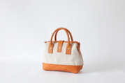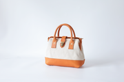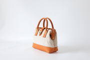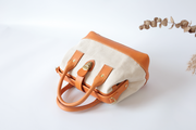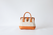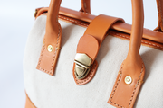 本体は、ナチュラルな生成りの帆布と植物タンニンなめし本革(牛革)を組み合わせ、クラシカルかつ上品な印象に仕上げています。前面のアンティーク調の差し込み金具がアクセントとなり、落ち着いた雰囲気の中にどこか可愛らしさも感じられます。