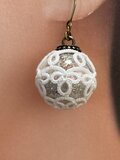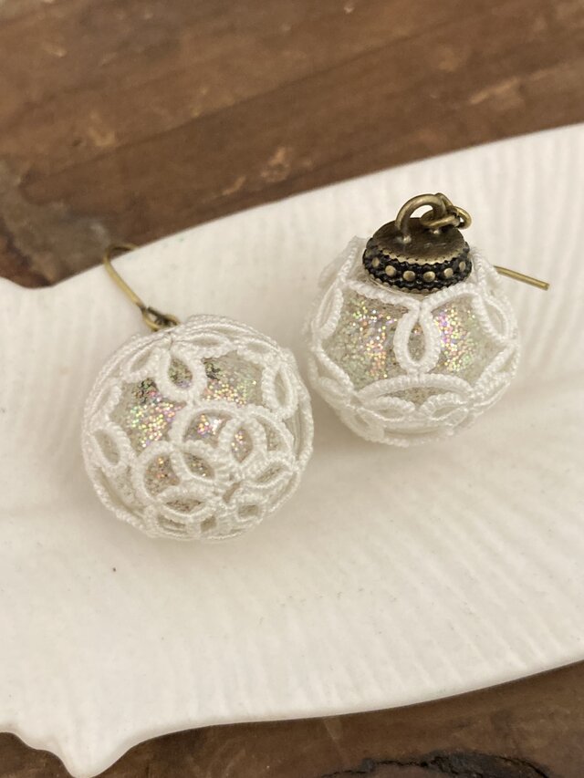 光を閉じ込めたようなガラスボールに、タティングレースの繊細な編み目がやさしく包み込むピアスです。