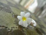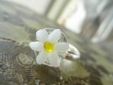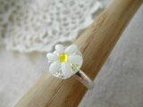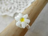 グラスフュージングという技法で丁寧に手作りいたしました、ガラスの小さなマーガレットチャームを、リングに仕立てました。