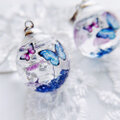 たまご形のガラスドームに2色の紫陽花とガラスビーズ、ガラスビーズ、シルバーのかすみ草、モルフォ蝶をいれました
