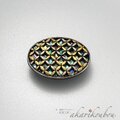 使いやすい楕円形の漆帯留め 桧の木地を七宝つなぎ文様に深く彫刻し、浮き彫りにした文様部分を純金蒔絵・純銀蒔絵、掘り込んだ部分には螺鈿細工で加飾した金沢漆器の帯留。