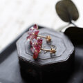鮮やかなピンク色のスピネルと、乳白色に虹色の遊色が浮かぶオパール、原石そのままの形と強い輝きが美しいダイヤモンドクォーツ。表情の違う鉱物の小さな結晶が複雑に重なり合い干渉することで、不思議な輝きを見せてくれます。