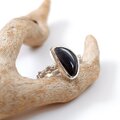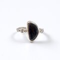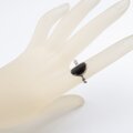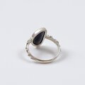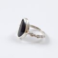 艶やかな漆黒が美しい石を、アームに粒飾りをあしらったルバーリングに留めています。