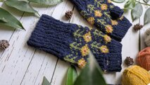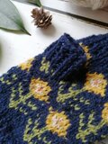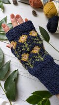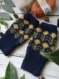 紺色(ネイビー)に黄色の大胆な花模様を編み込んだ、手編みのハンドウォーマーです。
