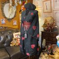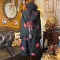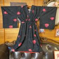 【着物リメイク ワンピース|ドレス + 帯サッシュベルト|和洋折衷 レトロ 古着 ハンドメイド 漆黒の地に、雲間からこぼれる深紅の花―― KW‑992】