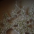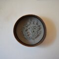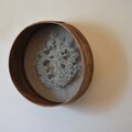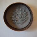 骨董市で見つけた昔の篩を使って制作したオブジェです。篩の目に綿の縫い糸を通して、虫食いのアカソの葉を生の状態で縫い絡めるように留めています。アカソの葉が乾燥して縮んだため、糸を通してできた輪郭より、葉本体のほうが少し小さくなっています。葉の穴は虫食い跡で、手を加えていません。古民具がベースなので、落ち着いたシックな雰囲気になっています。