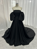 実例写真!パーティードレス ブラック ベアトップ パフスリーブ 細見えシルエット ロングトレーン