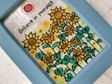 光が当たると、ひまわりの色合いやデザインが優しく反射し、見るたびに新たな楽しみをお届けします。サイズは縦約12cm・横約16cm程度で、ガラス絵の具を使用した薄いアクリルに、夏の美しい風景が描かれています^^