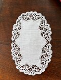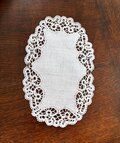 麻の楕円形ドイリー。麻地の形に沿ってフラットに編み込んだ麻のレース縁は上級者の作品で大変魅力です。