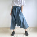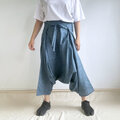 優しい履き心地の三角の形のパンツです。着物地をたっぷりと使ってゆったりとした作りです。ウエストはチベタンスカートと呼ばれる形を参考にしたつくりです。脇の紐を結んでウエストを調節し、余った脇の布を前で結びます。脇の片側はボタンにしましたのでご自分のウエストに合わせてボタンの位置を調整していただくことも可能です。