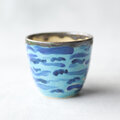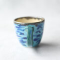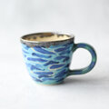 青色の化粧泥を刷毛塗りした地に藍色の横線でリズミカルに模様を描いたモダンアート柄のマグカップです。