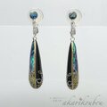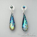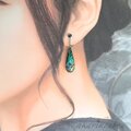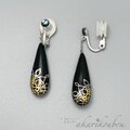 細長い雫型に彫刻した木地に、螺鈿細工とプラチナ箔・純金箔でレース模様を箔押しした面と、黒漆をベースにレース模様を箔押しした、両面使える漆塗り螺鈿イヤリング。