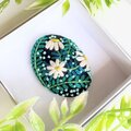 サーモンピンクの地に黒い花の刺繍、ありそうでなかったこの色のとりあわせ、すてきなブローチでした。