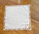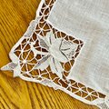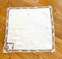上質の四角の綿の縁にブリティッシュ刺繍を施し、一角にはカットワークの薔薇の刺繍を嵌め込んだ上品な作品です。