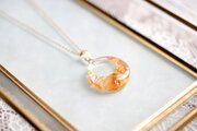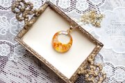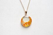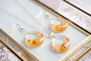オレンジと黄色いお花の花びらを敷き詰め、オーロラのラメを乗せたペンダント。