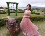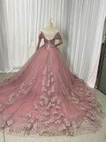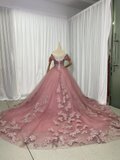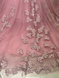 実例写真!カラードレス ピンク 取り外しオフショルダー 花柄のモチーフ刺繍が美しく 編み上げ 前撮り