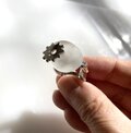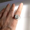 ガラスは、幅1センチくらいのボリュームのあるもので、中心に穴があり、そこに、銀のパイプを通して、リングの台に留めてあります。直径は約2センチです。