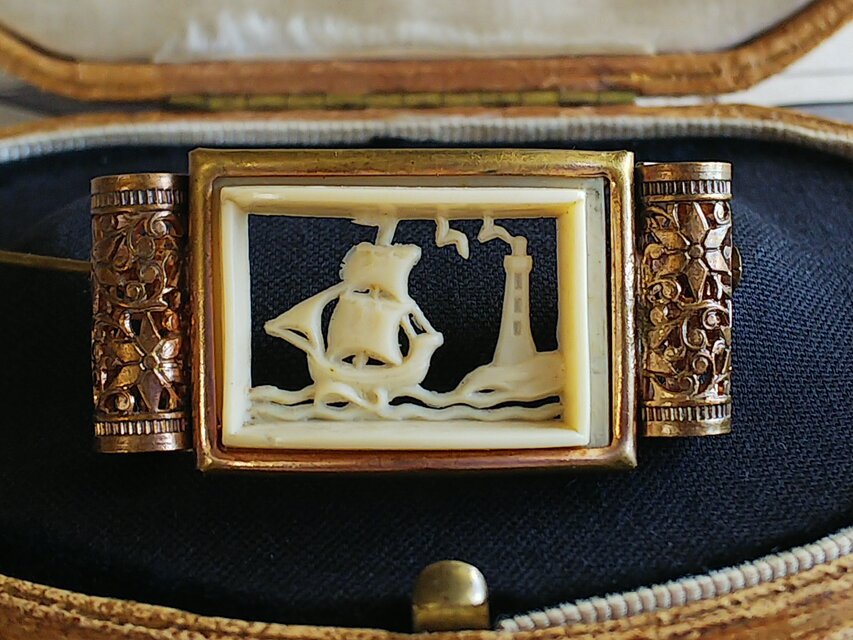 フランスヴィンテージ セルロイド製 ガレオン船と灯台のブローチ