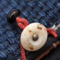 紐に通した緒締玉は200年前に製作されたガラスのとんぼ玉です。