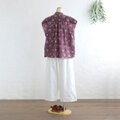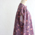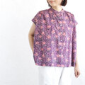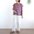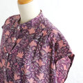 《数量限定》快適 インド綿ブロックプリント フレンチスリーブバンドカラーブラウス (ピンク花/パープル)TP42